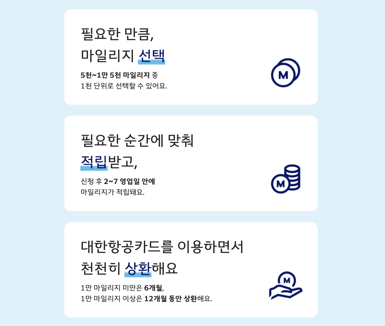 - 1천 마일 단위로 자유롭게 선택이 가능합니다 - Step 3 : 대한항공 홈페이지 / 앱에서 적립된 마일리지 확인