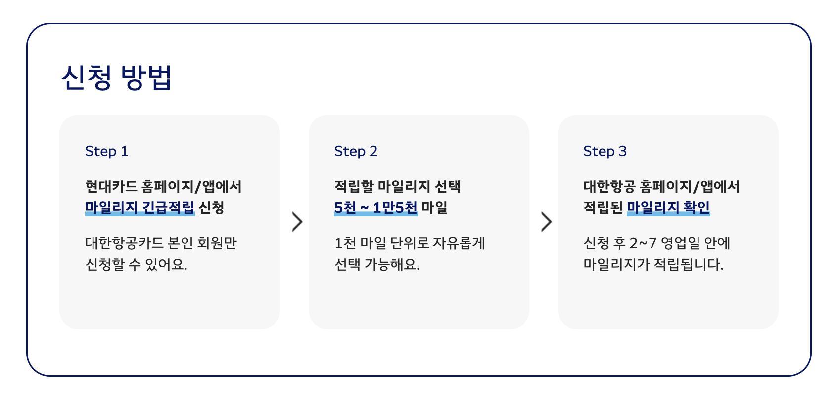 - Step 1 : 현대카드 홈페이지 / 앱에서 '마일리지 긴급 적립' 신청