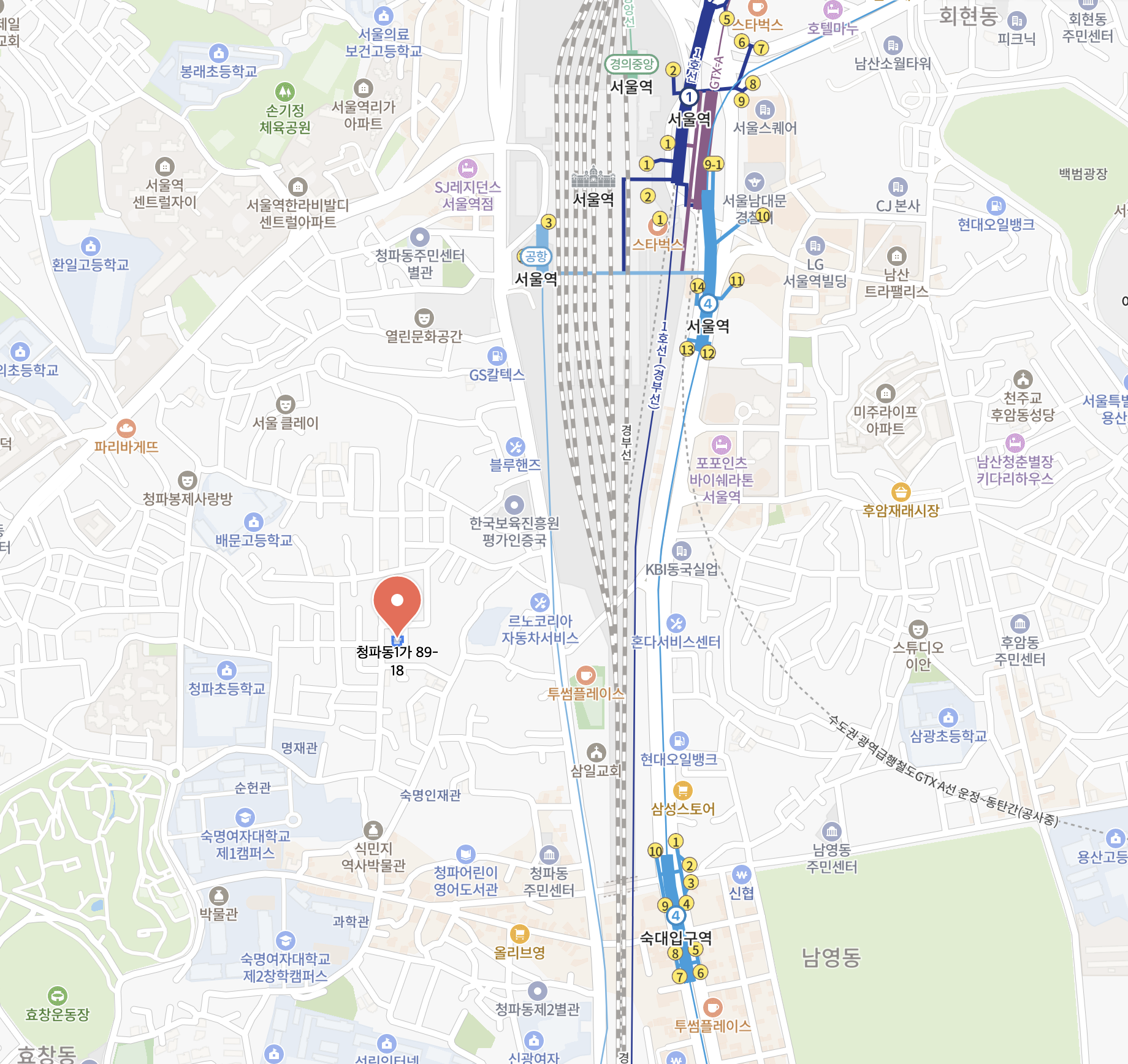 입지 측면에서 청파2구역은 매우 유리한 조건을 갖추고 있습니다. 지하철 1호선 서울역, 남영역과 4호선 숙대입구역이 도보권이며, 향후 GTX-A, GTX-B 노선 및 서울역 북부역세권 개발 등이 예정되어 있습니다.