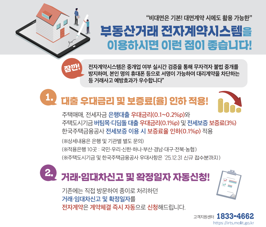 - 은행 주택담보대출 또는 전세자금대출 이용 시 전자계약을 하면 일반 계약 대비 0.1 ~ 0.2%포인트 금리인하 혜택이 제공됩니다.