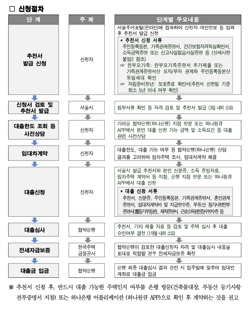 - 대상 주택: 서울시 기준 “임차보증금 3억 원 이하, 월세 70만 원 이하” 등의 조건이 있음. - 신청 및 은행 대출
