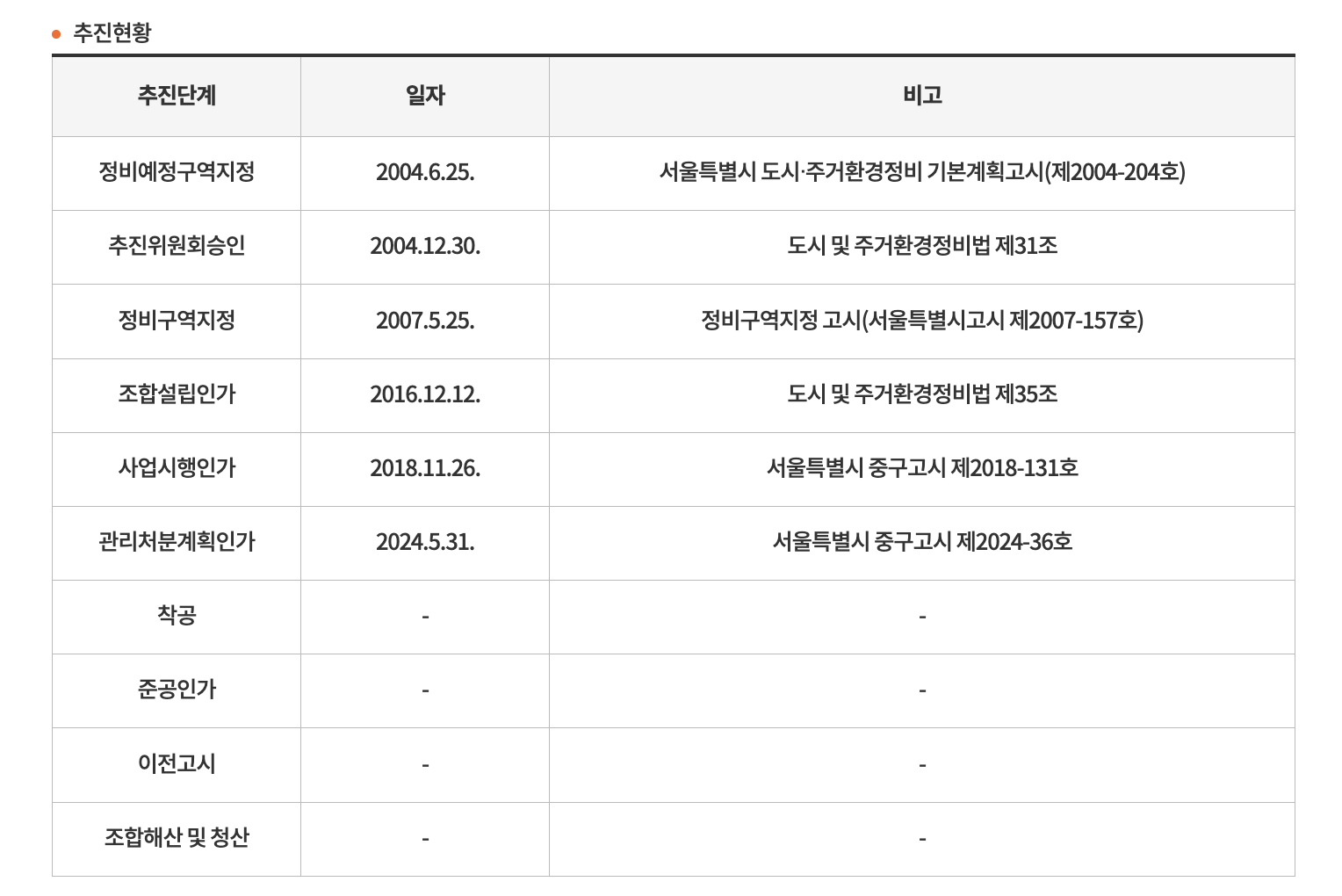 | 진행단계 | 관리처분계획인가 완료 → 이주 및 착공준비 중. | 착공 예정 시점 지연 여부 주시 |