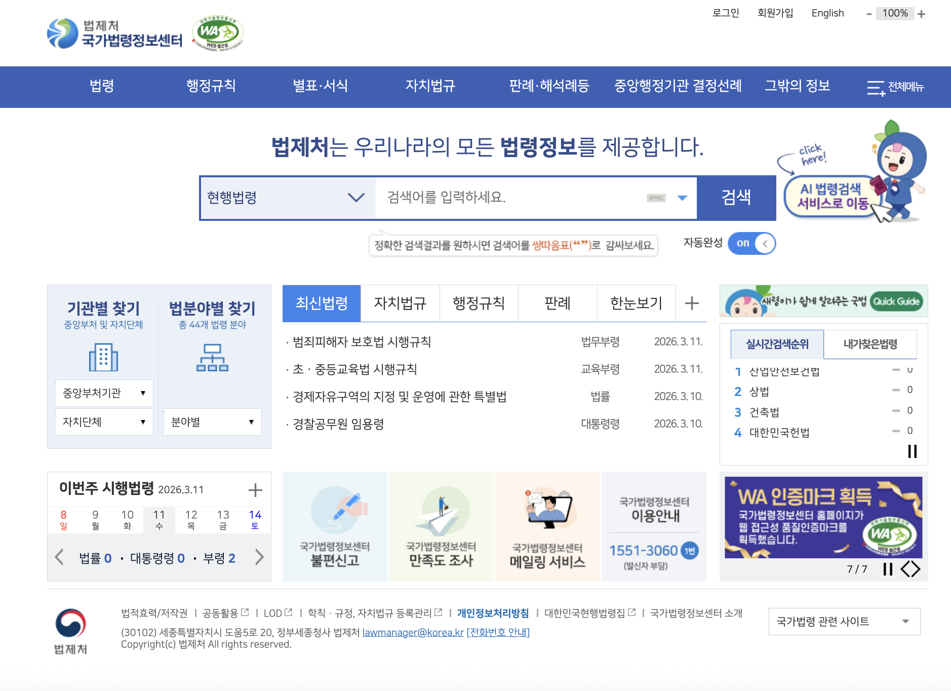 국가법령정보센터(Law.go.kr)는 법제처에서 운영하는 대한민국 공식 법률 포털입니다. 2026년 현재, 단순 조회를 넘어 AI 검색과 맞춤형 알림 서비스가 강화되어 누구나 전문가처럼 법을 찾을 수 있습니다.