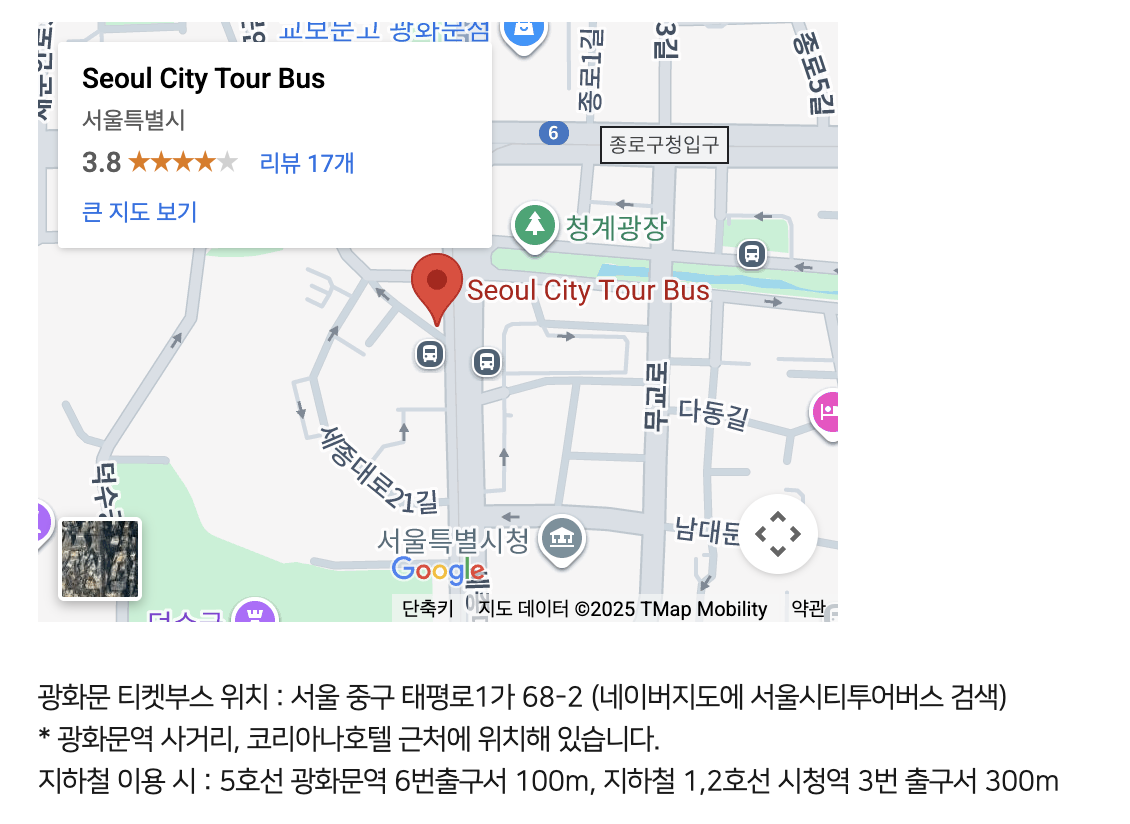- 1,2호선 시청역 3번 출구에서 약 300m 거리 - 매표소는 광화문 동화면세점 앞 / 티켓박스 형태로 운영됩니다.